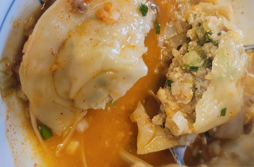 어른 4명이 깡통만두에서 만나서 만두전골 대(3~4인) 시켰습니다. 동그랗게 빚어진 만두가 고기만두이고, 길쭉하게 빚어진 만두가 김치만두라고 하셨어요. 만두피가 투명해 보일 정도로 얇고 그만큼 만두소를 많이 넣은 손만두 그 자체였습니다. 만두가 속까지 익어야 하기 때문에 만두가 끓기 시작한다고 바로 먹으면 안 되고, 직원분이 오셔서 양념을 풀어주신 후에 조금 더 끓이고 먹을 수 있었어요.