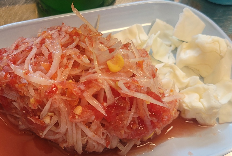 쏨땀은 이름만 들어보고 어떤 맛인지 전혀 가늠할 수 없었는데, 최근 TV 예능프로그램에서 접하고 너무나 궁금했던 메뉴였어요. 샐러드 종류이고 그린파파야로 만들었다고 하는데, 한국 음식으로 치면 김치에 가깝다고 해서 정말 궁금했어요. 그래서 이번에 드렁킨 타이에서 고민하다가 주문해봤는데, 처음 먹어보는 맛인데 정말 김치같으면서도 샐러드 같은 맛이지만 왜 김치라고 하는지 알 수 있을 정도로 새콤,달콤,매콤이 다 들어 있어서 입안을 개운하게 해주는 맛이었어요.