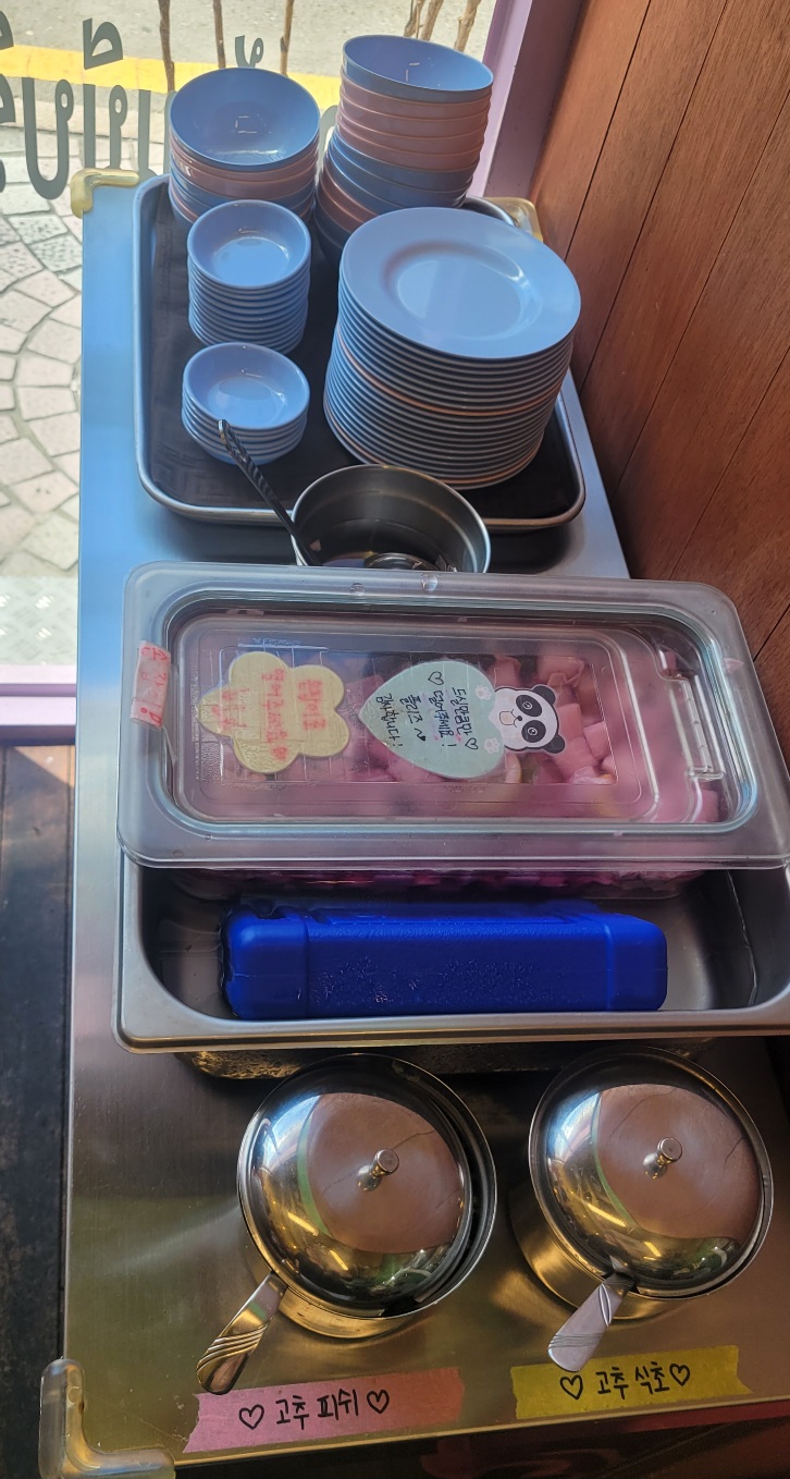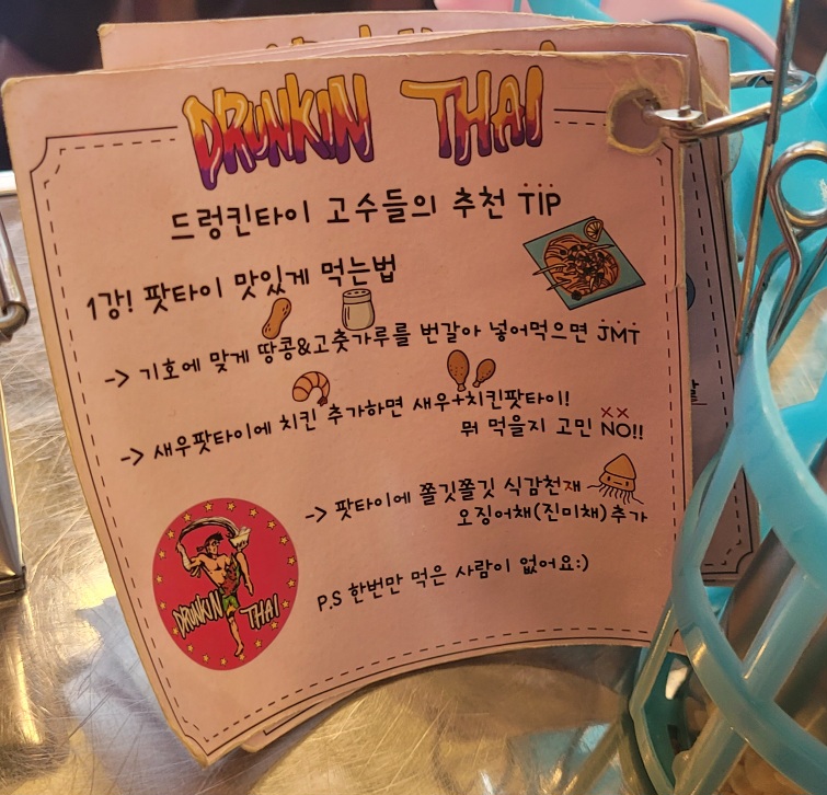 드렁킨 타이에서 팟타이를 맛있게 먹으려면 테이블마다 준비되어 있는 메모를 보고 그대로 따라하시면 될 것 같아요. 기호에 맞게 땅콩가루와 고춧가루를 넣어서 먹을 수 있도록 테이블마다 준비되어 있고, 피클이나 앞접시, 고추 피쉬와 고추 식초등은 필요에 따라 직접 가져다 먹을 수 있도록 셀프로 운영되고 있었어요.