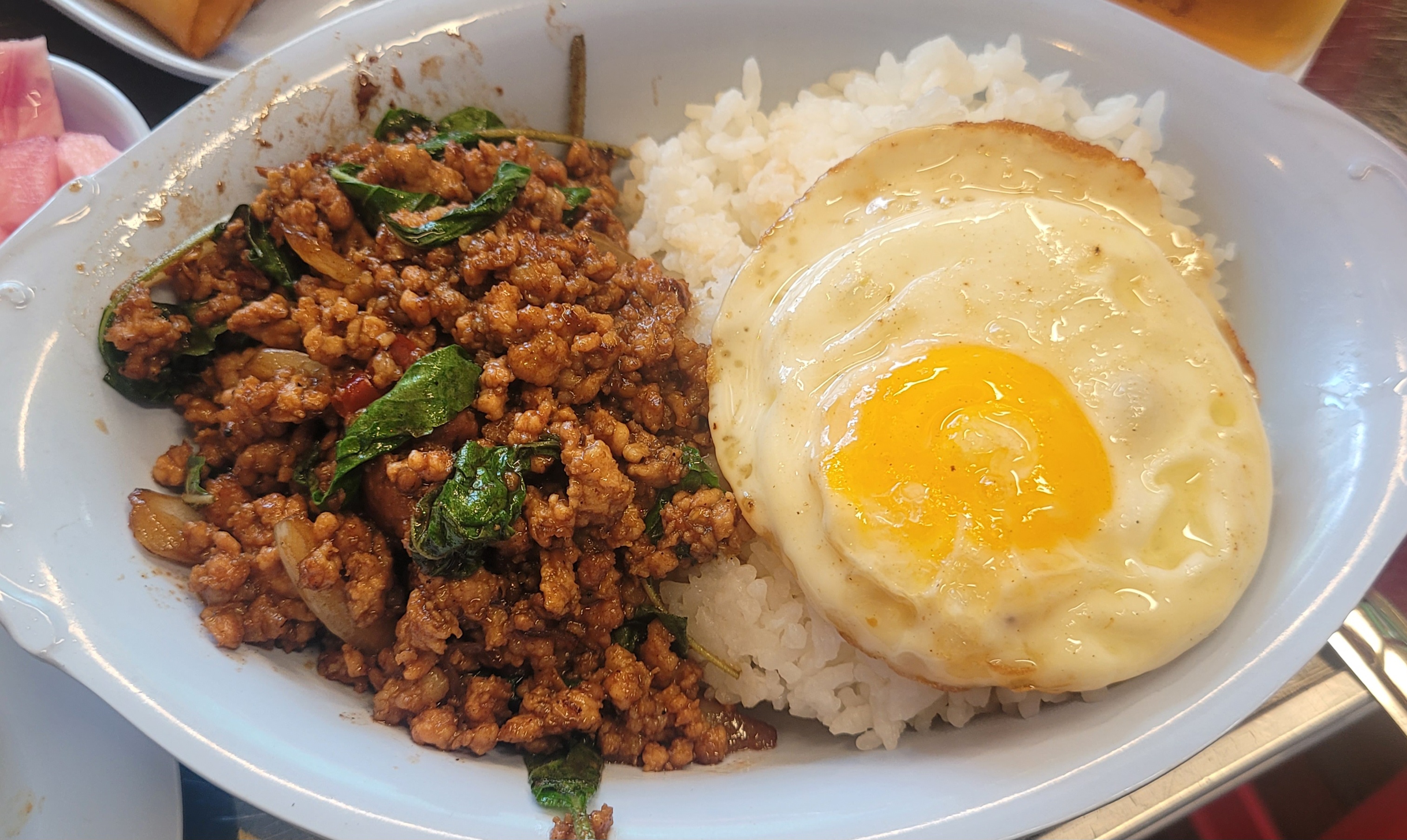 외우기 힘든 이름의 팟카파오무쌉은 잘게 다진 돼지 고기와 태국식 바질을 넣어서 매콤하면서도 달콤하게 볶은 밥인데요. 직원분께서 밥과 고기를 한번에 비비지 말고, 따로따로 먹는게 더 맛있다고 하셔서 그렇게 먹었는데 정말 맛있었어요. 매콤하지만, 많이 매운건 아니었고 느끼하지 않아서 더 좋았습니다.