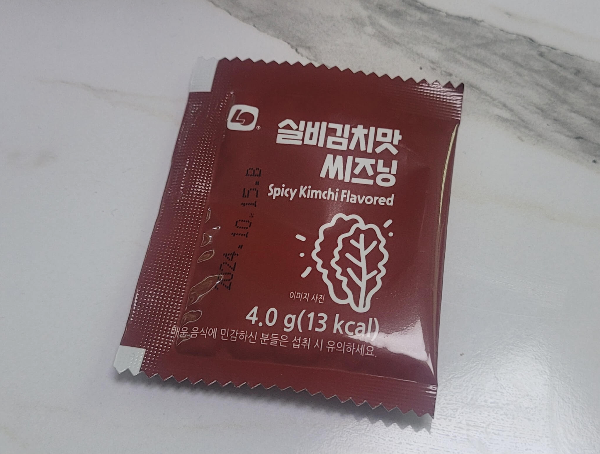겉으로 보기에는 일반 씨즈닝과 다를 게 없어요. 4,0g에 13kcal 인 실비김치맛 씨즈닝은 도대체 어떤 맛일지 너무 궁금했습니다. 얼른 개봉을 해보니 라면스프랑 똑같아 보였어요. 그런데 냄새가 김치 냄새가 확 풍기는 것이 신기했습니다.