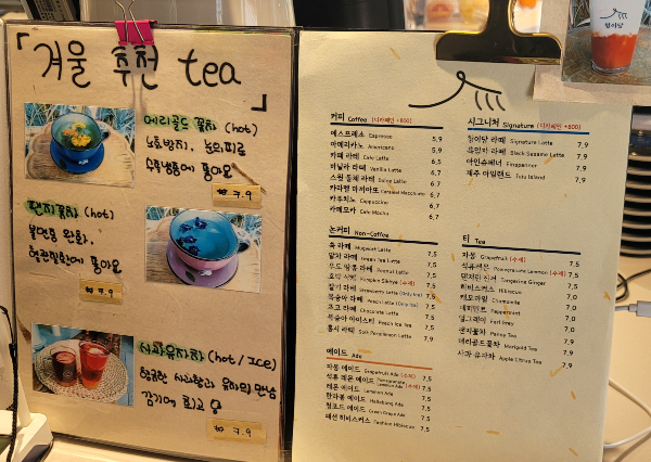 청이당에서는 1인당 1음료의 메뉴를 주문해야 해요. 모든 커피 종류에는 800원을 축하면 디카페인으로 변경 가능하고, 아메리카노 5,900원, 카푸치노 6,700원, 복숭아 아이스티 7,500원, 레몬 에이드 7,500원 등으로 가격대가 조금 있는 편이에요. 커피도 다양하게 있고, 쑥 라테, 우도 땅콩 라테등 논커피나 에이드, 차 종류도 많았어요. 그리고 청이당 시그니처 메뉴들도 있어서 저와 지인들은 시그니처 메뉴를 먹어보기로 하였습니다.